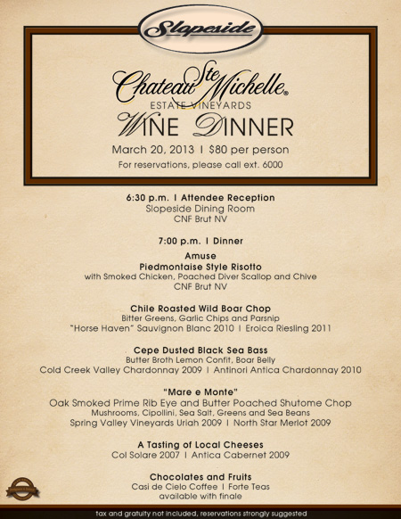 Seven Springs Mountain Resort will be hosting the Chateau Ste. Michelle Vineyards Wine Dinner in their Slopeside restaurant at 6:30 p.m. Wednesday March 20th, 2013. This dinner will feature a wine pairing for each course from the Chateau Ste. Michelle winery. I have posted the menu for your convenience. Reservations can be made by calling 800-452-2223 ext.6000. Seven Springs Mountain Resort is at 777 Waterwheel Dr. Seven Springs, Pa 15622.