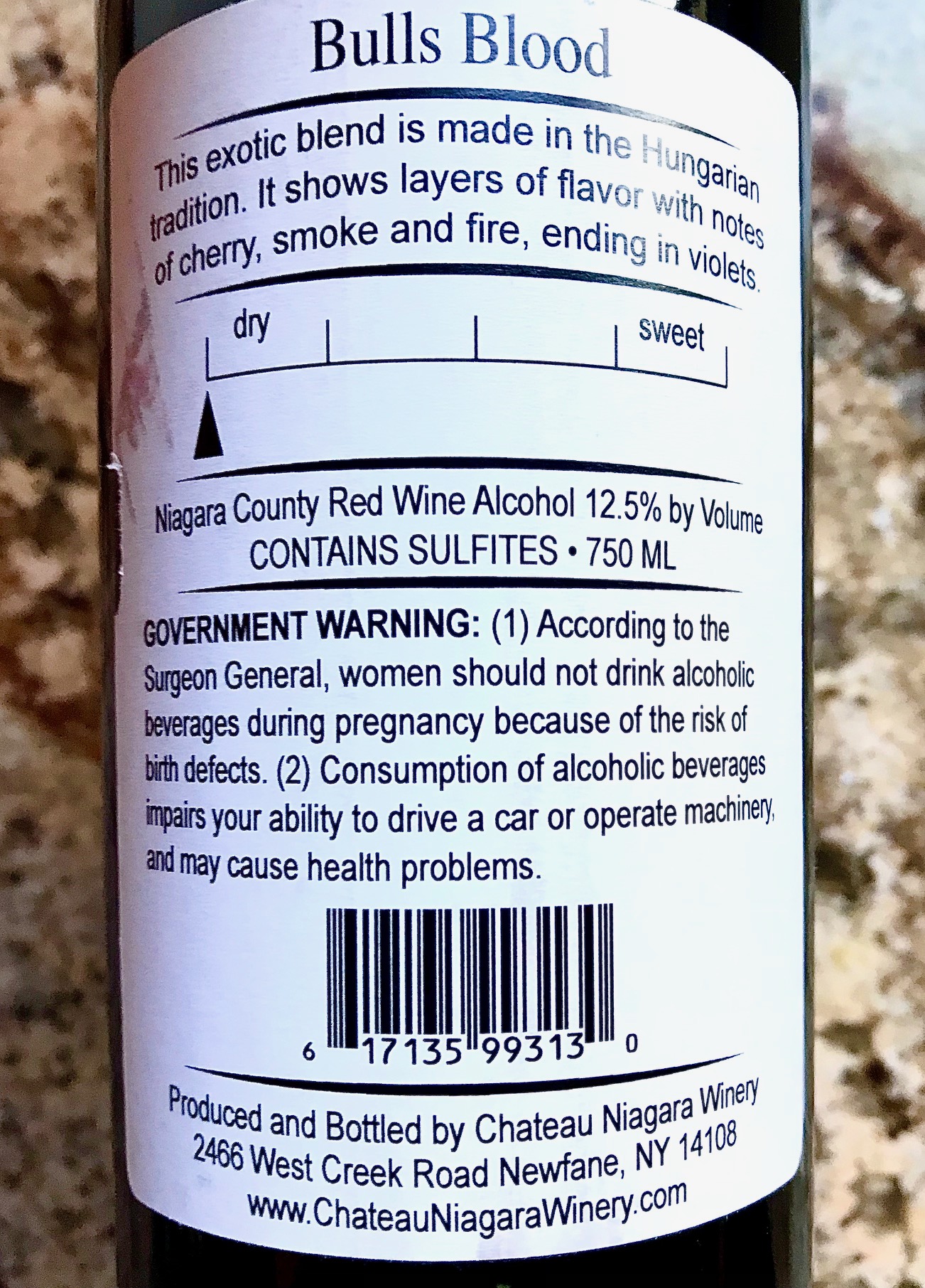 Bulls Blood being made in North America is not easily found but one exactly like the one-of-a-kind Chateau Niagara Bulls Blood would be impossible because, to my knowledge it is the only one made with a blend of Blaufrankish (Lemberger), Cabernet Franc, and the Hungarian red grape Turan (Agria). Turan is a teinturier grape, meaning like Saperavi and Chambourcin it has pigment in both its skin and pulp making for a richly colored juice when pressed. Jim Baker got his Turan as clippings for his vineyard in Newfane New York by chance when a West Coast vintner included them in a shipment of Saperavi clippings and as they say “The rest is history”.