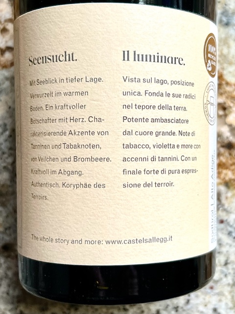 Castel Sallegg Lagrein 2019 has a very dark ruby color with faint floral aromas. Flavors of mixed black fruits are carried on a structured medium body with mild tannins appearing mid-palate. More than ample acidity throughout. Pairs well with any grilled or roasted red meat or pasta in a hearty red sauce.