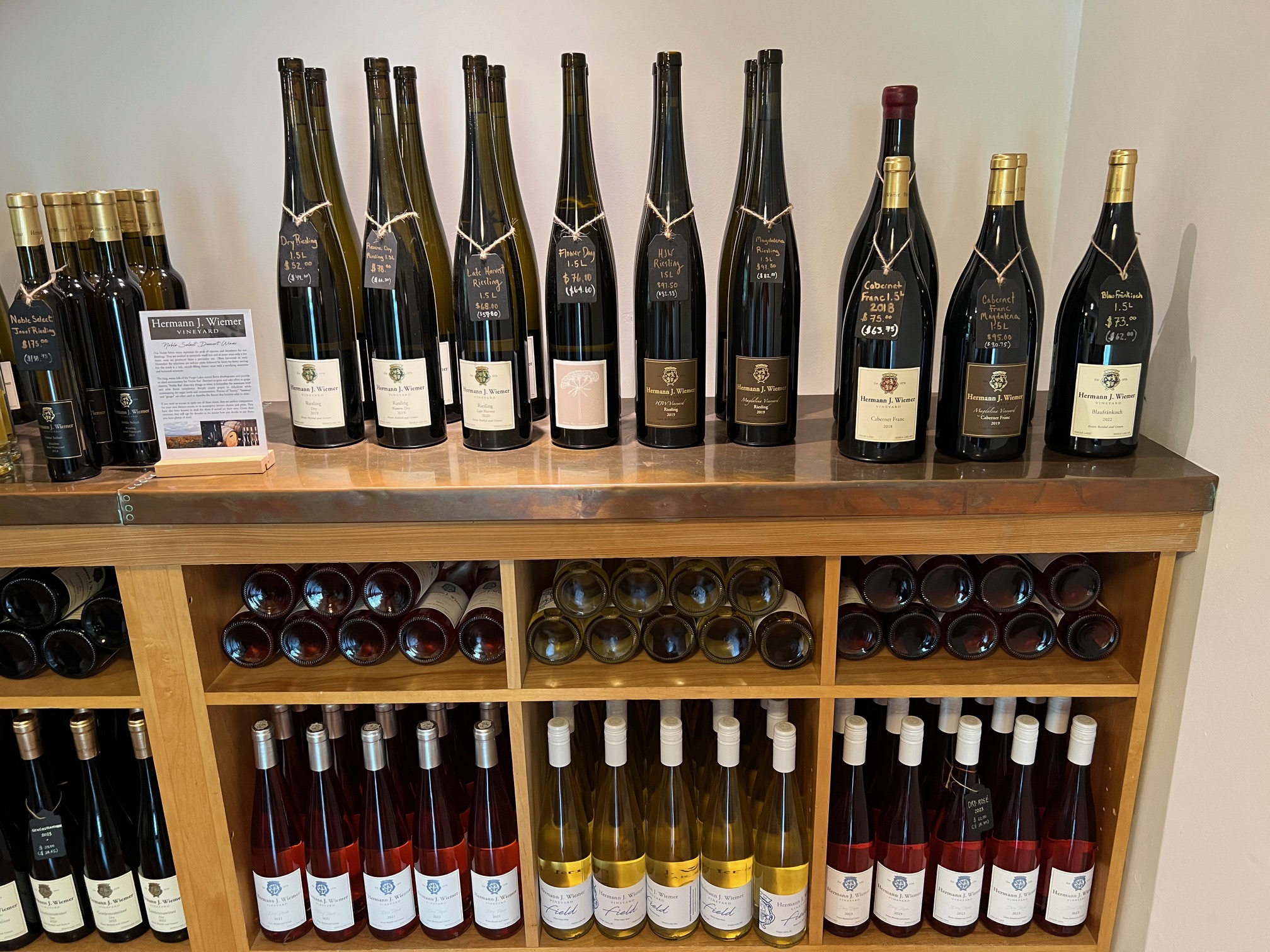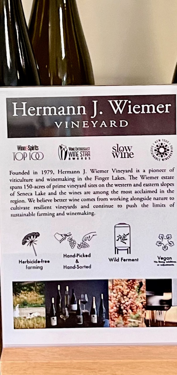 We enjoyed our tasting at Hermann J. Wiemer Vineyard. They have a well-deserved reputation for being a producer of world-class Riesling but their other wines are also very good. The tastings are à la carte and are served in small carafes that are enough for two. You choose the wines you want from a menu with each sample priced accordingly. You are seated at your own table, not standing at a tasting bar. Each table is assigned a knowledgeable attendant to provide guidance if needed and answer any questions you may have. We are big fans of Riesling and concentrated on those wines but we did sample a very well-made Blaufrankisch. Outside their tasting room, Wiemer offers their own nursery-grown grape vines for sale. As a gift for our winemaker friend, Rich Ripepi, we brought back a Riesling vine (clone 110(9) rootstock 3309) that has now found a new home in his vineyard at Ripepi Winery & Vineyard Monongahela, Pennsylvania.